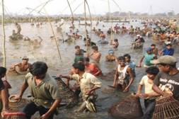 mankind. The mela starts with community fishing in the Jonbeel wetland. People